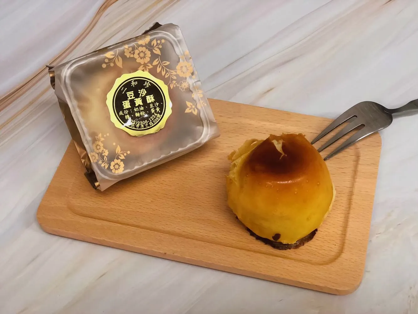 餅皮使用紐西蘭安佳無水奶油製作,一甲子以上的烘焙技術烘烤出的金黃色外觀,切開後層層的酥皮搭配著簡單卻又時尚的內餡,裡頭包覆著師傅特選的一顆熟成30天的鹹鴨蛋。
