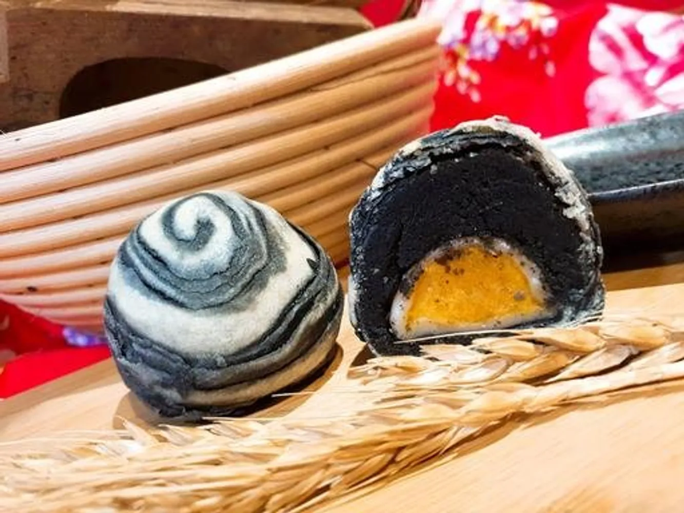 千層紋路如同艋舺八家將臉譜,我們在餅皮添加了竹炭粉,搭配濃郁的黑芝麻內餡,再將鹹鴨蛋黃切碎過篩,用麻糬包覆,增添豐富的口感~